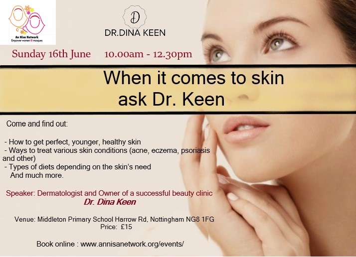 You will be offered the opportunity to ask a Professional Dermatologist, who has many years of first hand experience in hospitals and later on in the best beauty clinics in Nottingham, including her own – Town House Beauty Clinic www.townhousebeautyclinic.com – Dr. Dina Keen